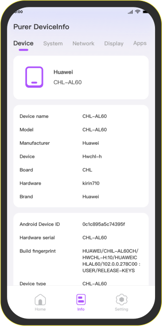 Device Information Viewing: Covers detailed information such as device model, system version, screen status, memory usage, battery health, CPU load, and more.